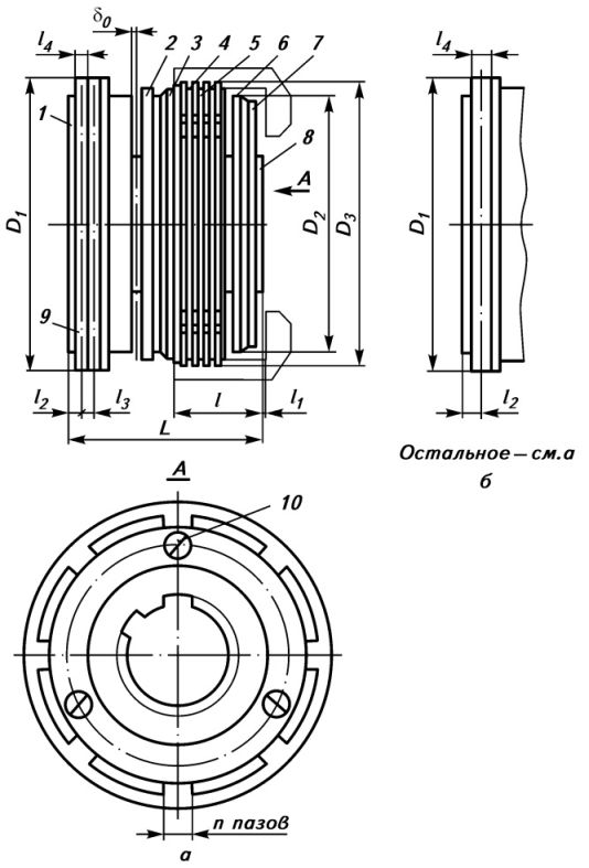 Общий вид, габаритные и установочные размеры контактной быстродействующей муфты (а) и контактной масляной и сухой муфты (б): 1 - корпус; 2 - якорь; 3 - гайка; 4 - пакет внутренних дисков; 5 - пакет наружных дисков; 6 - нажимной диск; 7 - фиксатор; 8 - втулка; 9 - контактное кольцо; 10 - винт