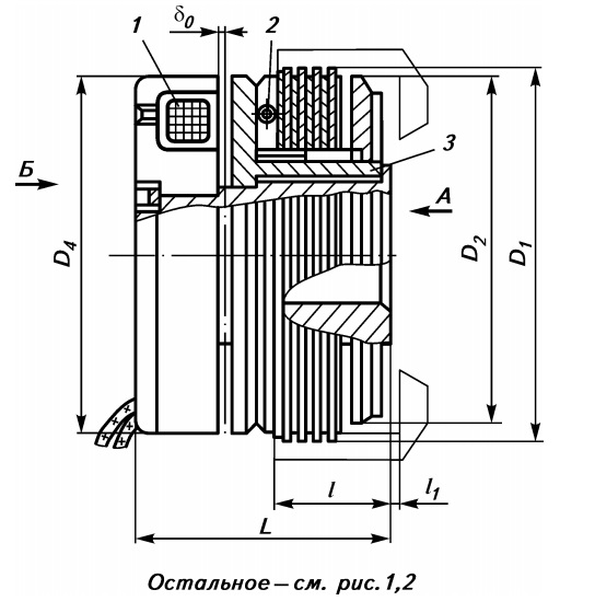 Общий вид, габаритные и установочные размеры тормозной муфты: 1 - катушка возбуждения; 2 - винт; 3 - тяга